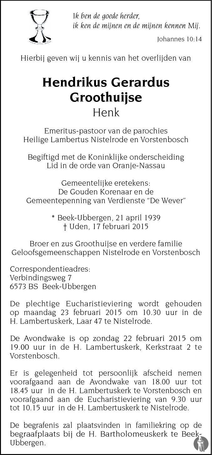 Op 75 jarige leeftijd is oud pastoor Henk Groothuijse overleden. Groothuijse was pastoor in Vorstenbosch vanaf 1990 toen de parochie opging in de pastorale eenheid Nistelrode Vorstenbosch tot 2008. Vanaf 1976 was hij al pastoor in de parochie Nistelrode. Op zondag a.s. is er om 19.00 uur een avondwake in de parochiekerk van Vorstenbosch. De uitvaartmis is op maandag om 10.30 uur in de parochiekerk van Nistelrode.