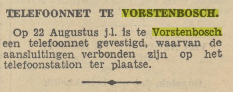 Vorstenbosch werd aan het telefoonnet aangesloten in 1928. Op 8 maart van dat jaar melde de krant dat een publieke telefooncel bij A. van Heeswijk (Bakker Toon van Heeswijk) zal worden gevestigd.