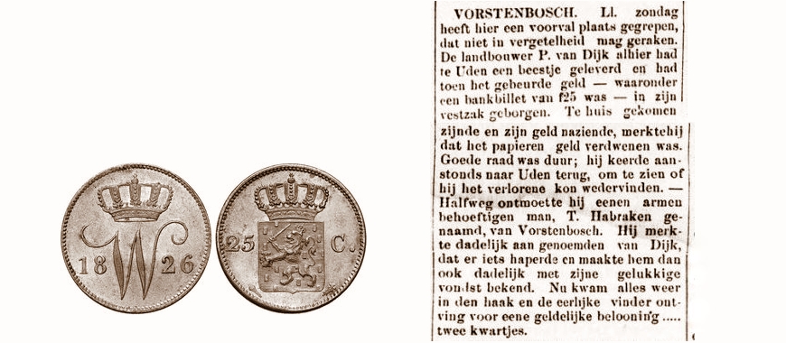 “Vorstenbosch: Zondag heeft hier een voorval plaatsgegrepen, dat niet in de vergetelheid mag geraken. De landbouwer P. van Dijk alhier had te Uden een beestje geleverd en had toen het gebeurde geld -waaronder een bankbiljet van fl 25 was- in zijn vestzak geborgen. Te huis gekomen zijnde en zijn geld naziende, merkte hij dat het papieren geld verdwenen was. De goede raad was duur; hij keerde aanstonds naar Uden terug, om te zien of hij het verlorene kon wedervinden. Halfweg ontmoette hij eenen armen behoeftigen man, T. Habraken genaamd, van Vorstenbosch. Hij merkte dadelijk aan genoemden van Dijk dat er iets haperde en maakte hem dan ook dadelijk met zijne gelukkig vondst bekend. Nu kwam alles weer in den haak en de eerlijke vinder ontving voor eene geldelijke belooning….twee kwartjes.”